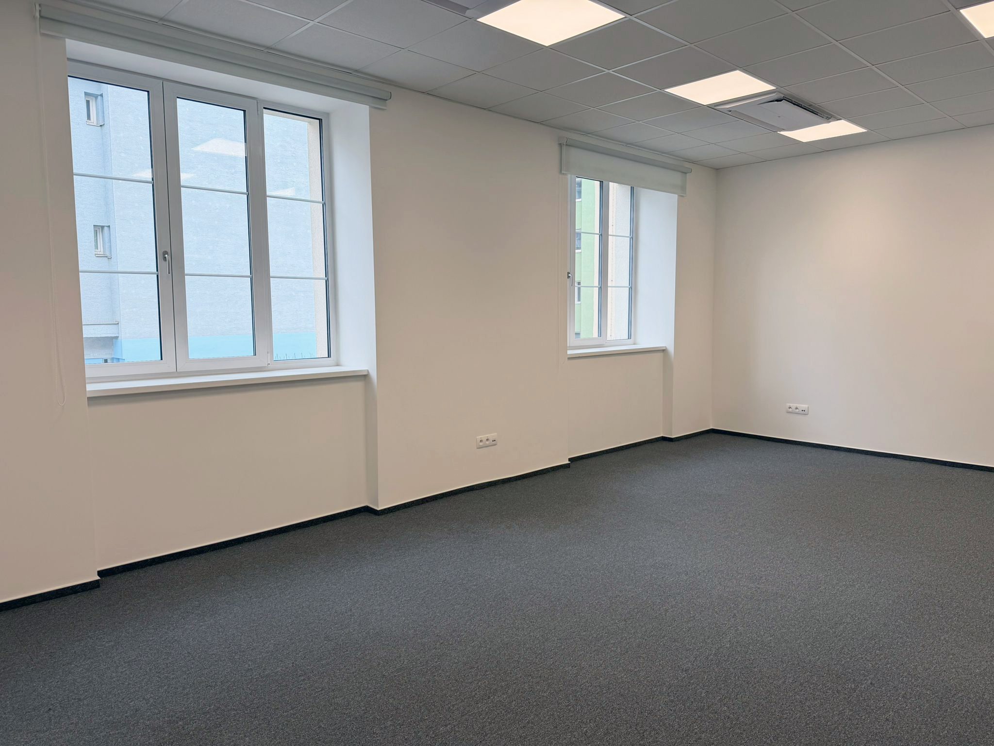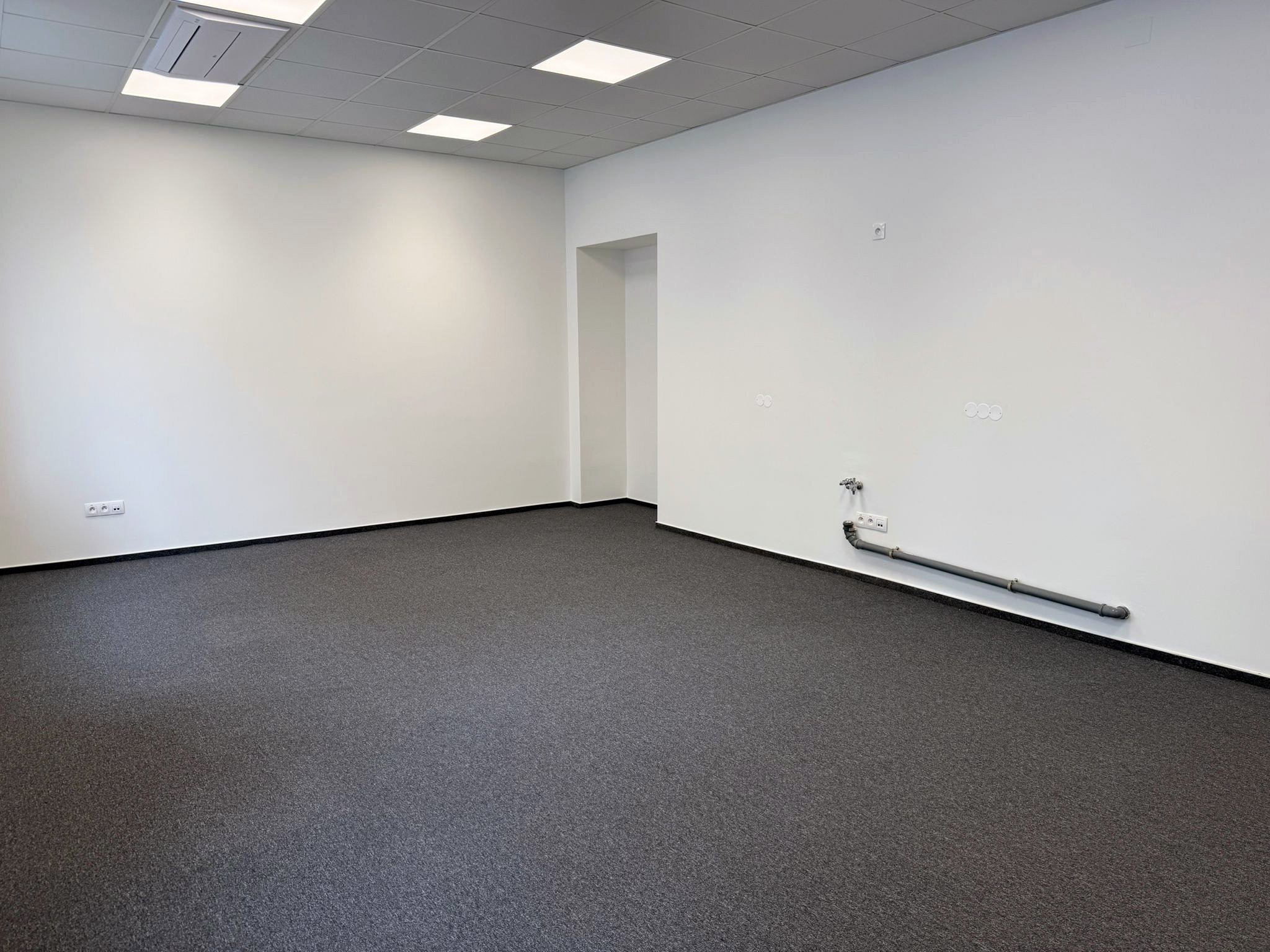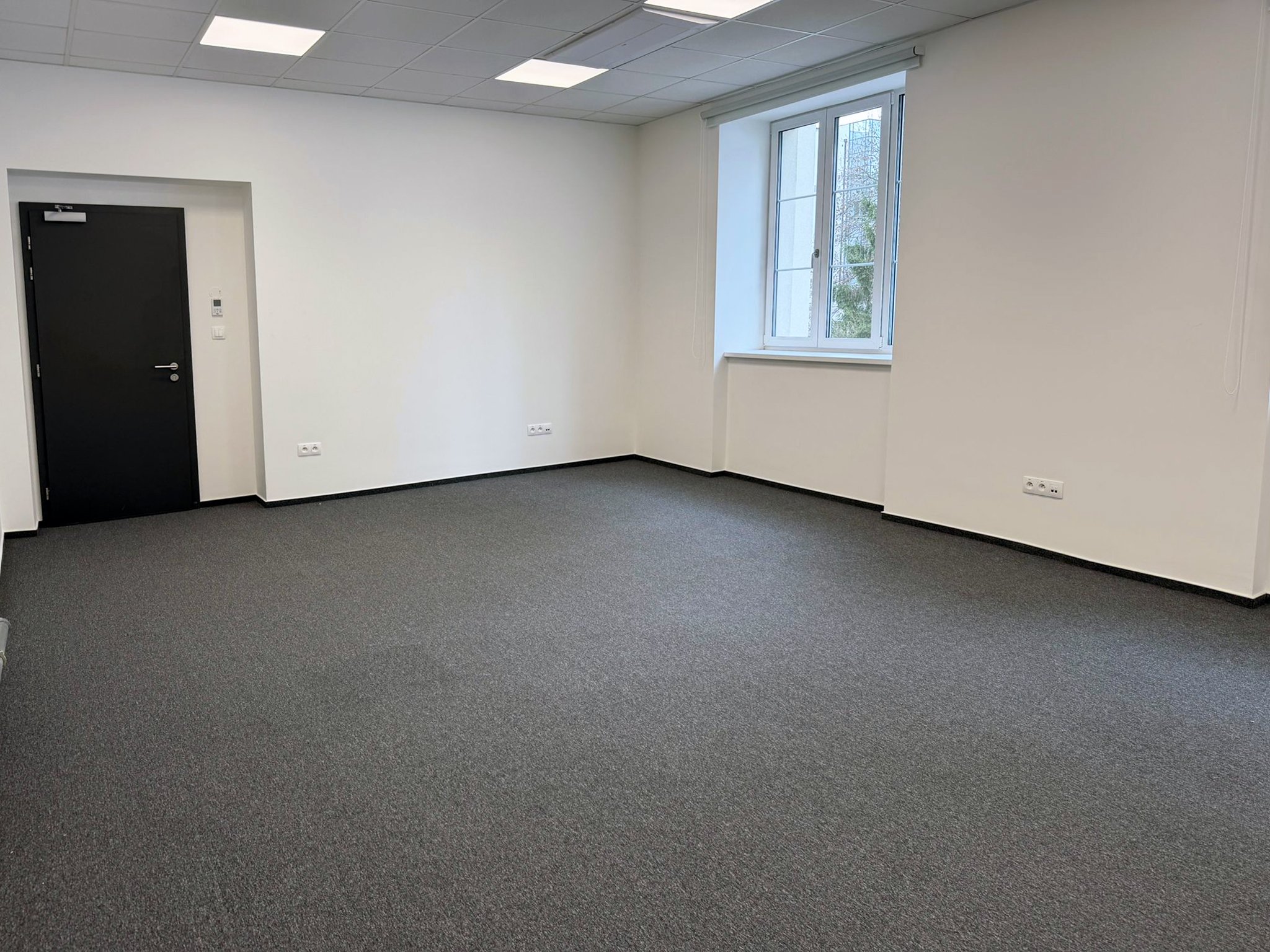 Kancelář je nevybavená, má bílou výmalbu, plastová okna s izolačním trojsklem i zastínění látkovou roletou. V prostoru je nový podhled a na podlaze uložen zátěžový koberec s lištou. Vstupní dveře do kanceláře jsou opatřeny nadsvětlíkem. Samozřejmostí je klimatizace. Jedná se o ilustrační vizualizaci.